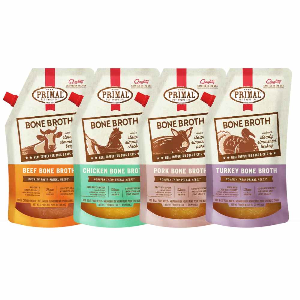 Add vital hydration to your dog or cat’s diet with Primal Bone Broth. Available in four flavorful recipes, Bone Broth provides beneficial nutrients to support digestion and joint and liver health.
