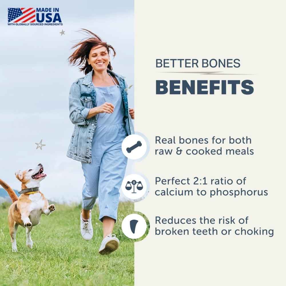Many dogs struggle to eat whole bones. Better Bones is a safer alternative that’s suitable for senior dogs, puppies and cooked diets. There’s no need to worry about choking or splintering and no need to add unnatural calcium to cooked foods. It’s bones made better!