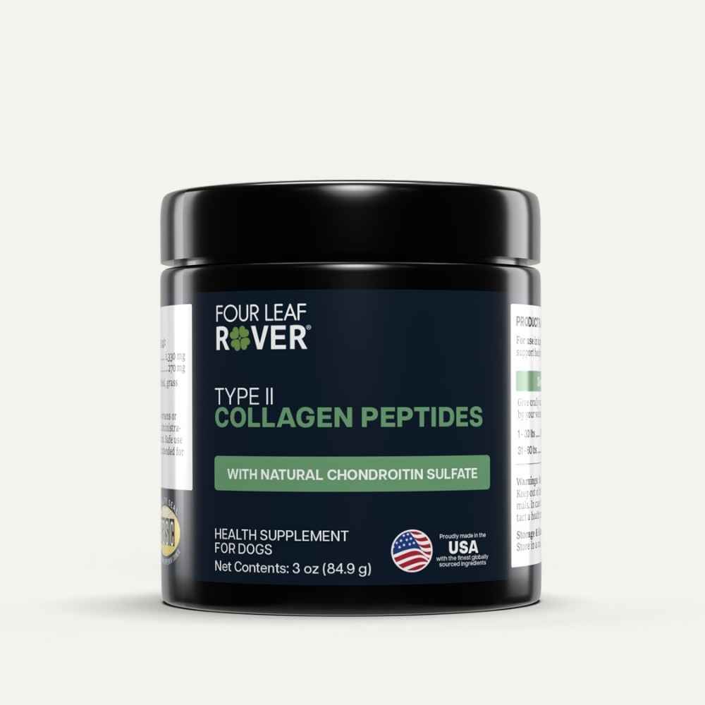 Four Leaf Rover’s Collagen for dogs is made from just one ingredient: 100% grass-fed, pasture-raised New Zealand beef collagen. Rich in Type I and Type II collagen, it delivers highly absorbable peptides and amino acids that support key systems in your dog’s body: