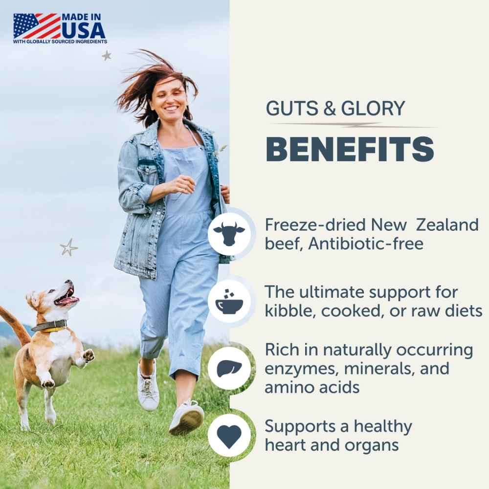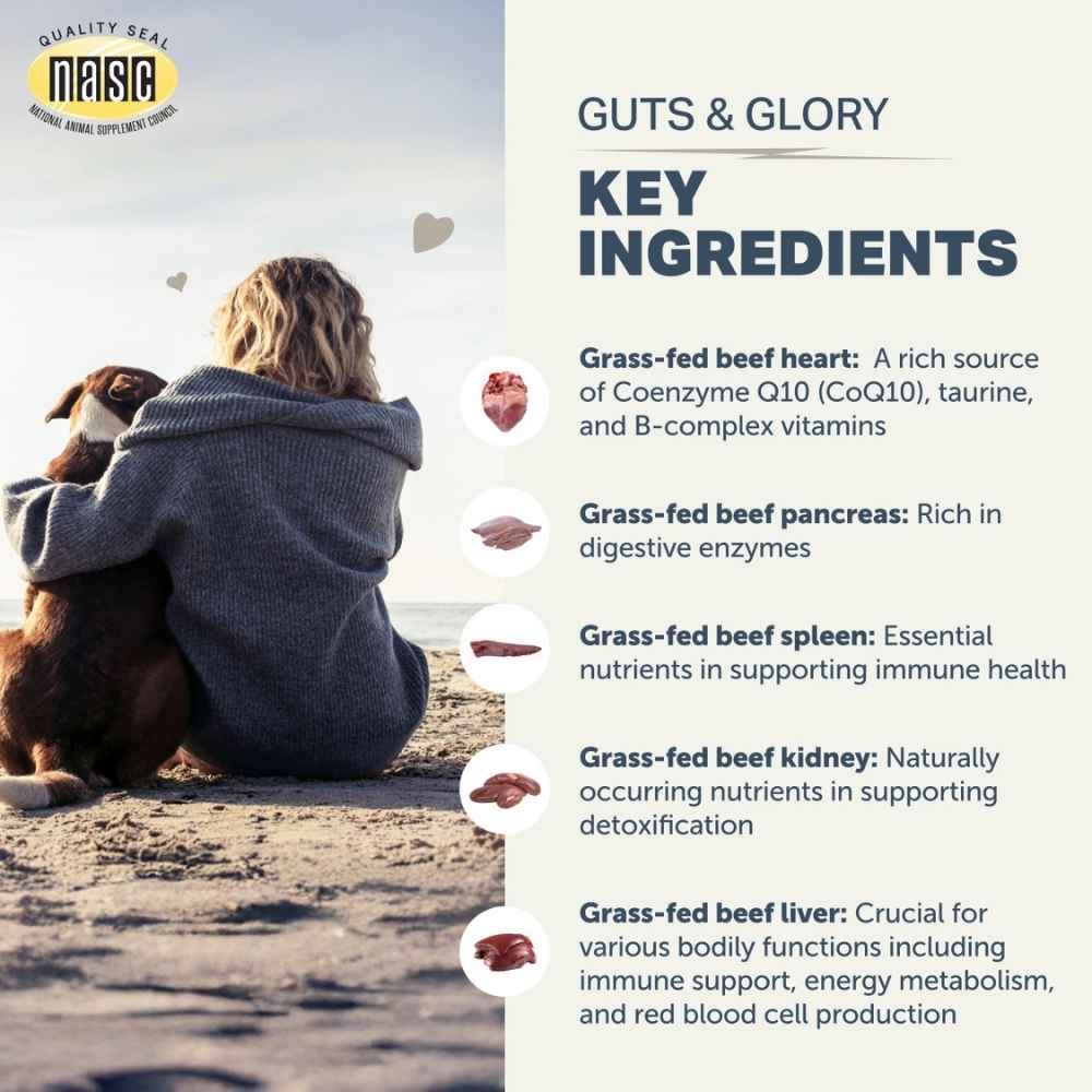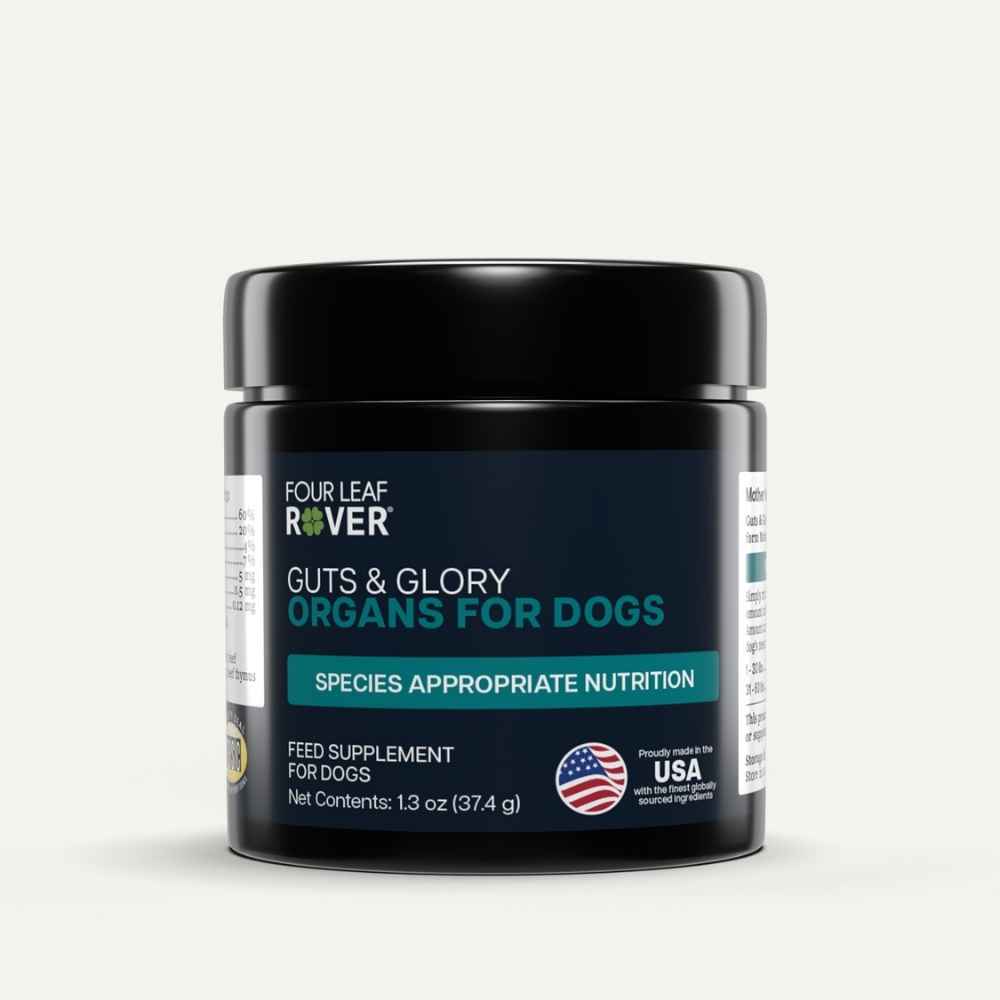 Four Leaf Rover Guts & Glory is a veterinarian formulated blend of organs and glands is the natural way to add multivitamins and taurine to your dog’s meals.