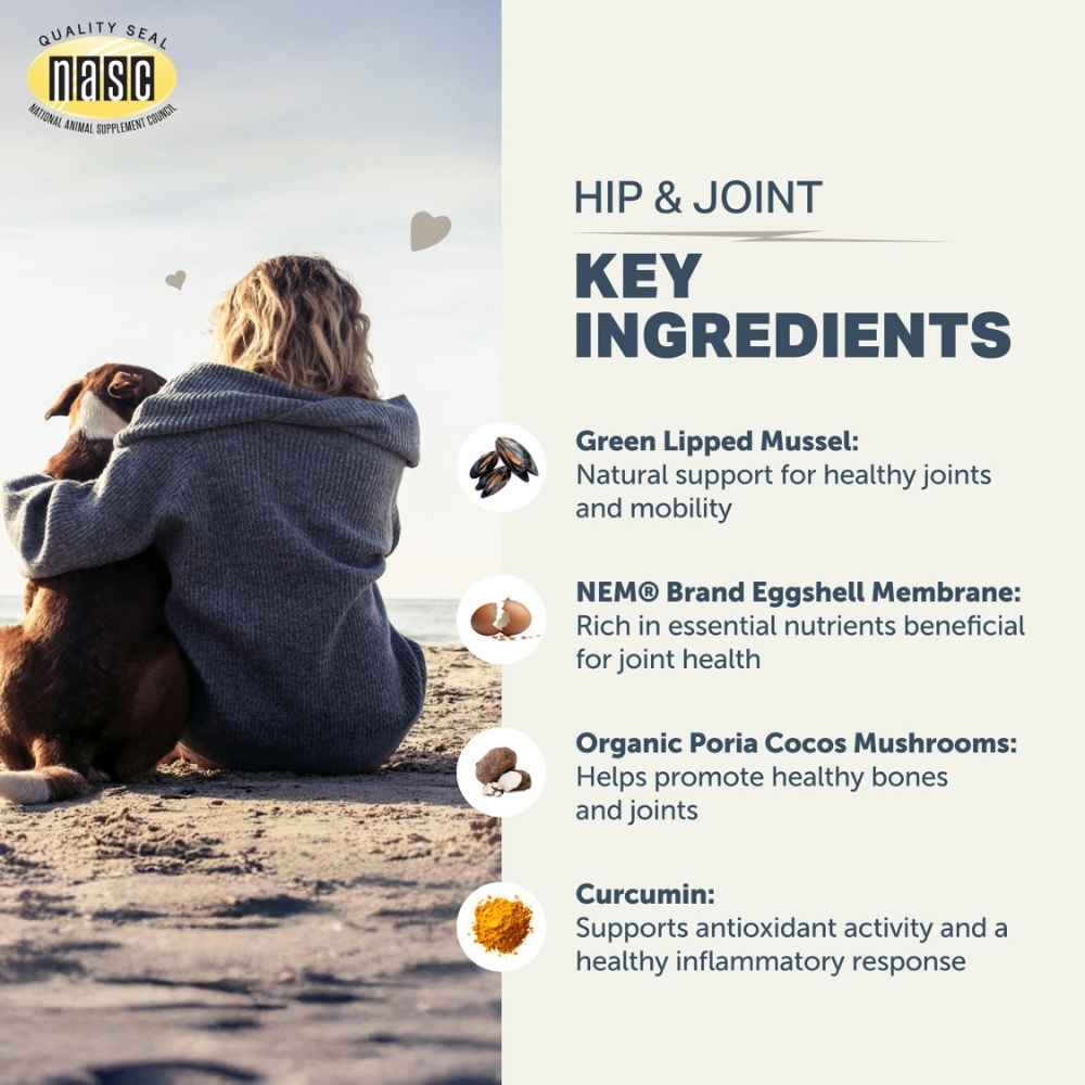 Don’t let joint pain slow your dog down. Hip & Joint is a powerful combination of green lipped mussels, eggshell membrane, 95% pure curcumin and poria mushrooms to naturally support healthy joints.