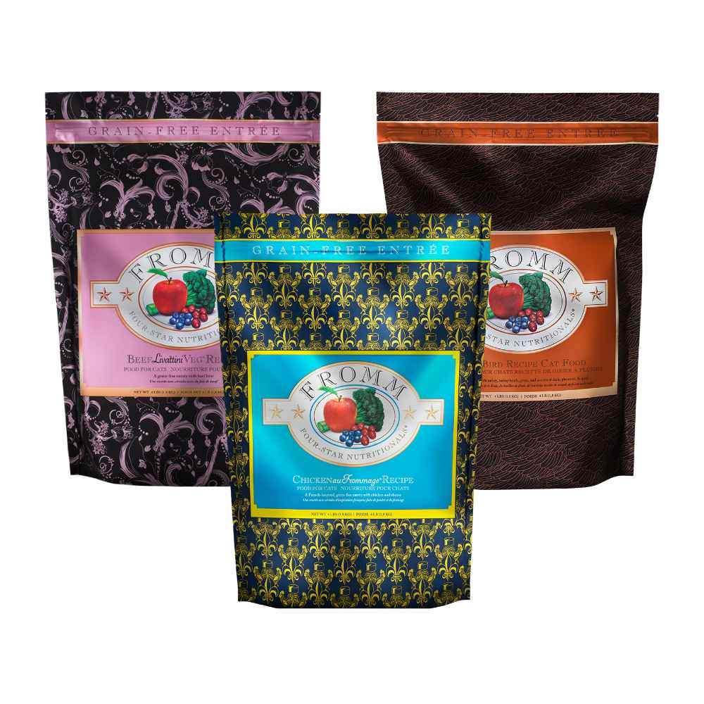 Fromm Four Star Grain Free Dry Cat Food offers cats a variety of entrées inspired by global cuisine. Prepared in small batches at their Wisconsin facility.