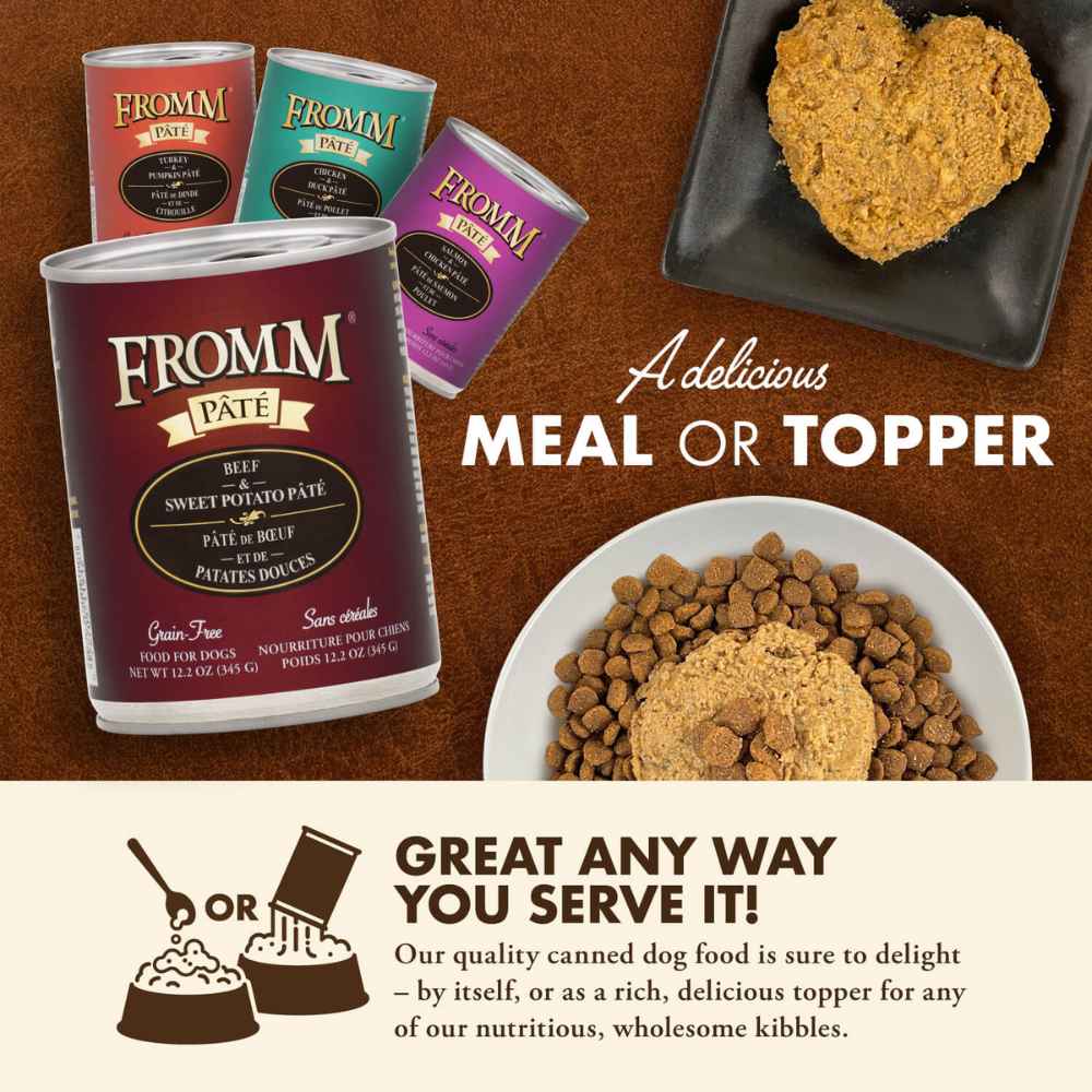Fromm Pate Canned Dog Food are complete and balanced a great complement to your dog’s dry food or on its own. A higher moisture content can help your pet with hydration and feeling full without increasing their calorie intake. Carefully crafted without the use of artificial or synthetic colorings, dyes and preservatives.