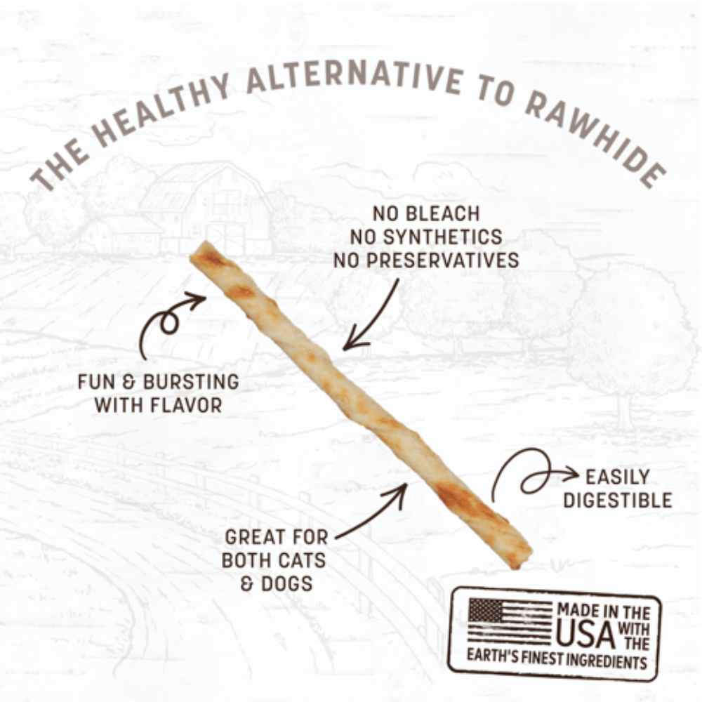 Dogs like to chew on things, if you’ve ever lived with a dog you know that is true! But… many chews on the market are not very good for your pets. They contain chemicals, they are made in places without the strict production guidelines we have in the United States, and sometimes – they are just plain rawhide. None of these are good options for your pet – so we created the No-Hide; the super healthy, long-lasting, and mind-blowingly tasty chew.