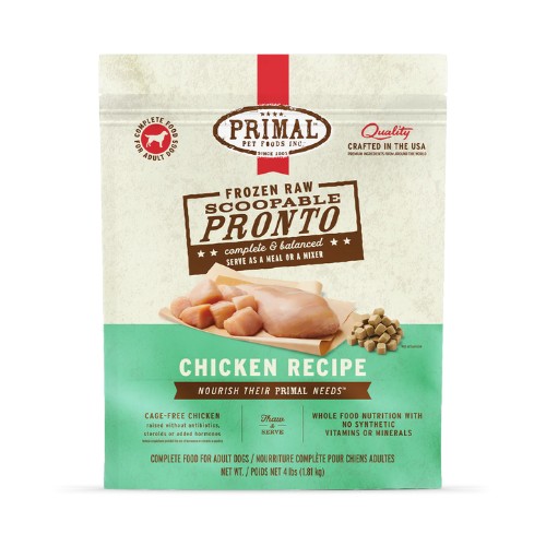 Beef and Chicken Canine Raw Frozen Pronto are available in 3/4 lb and 4 lb resealable bags.
