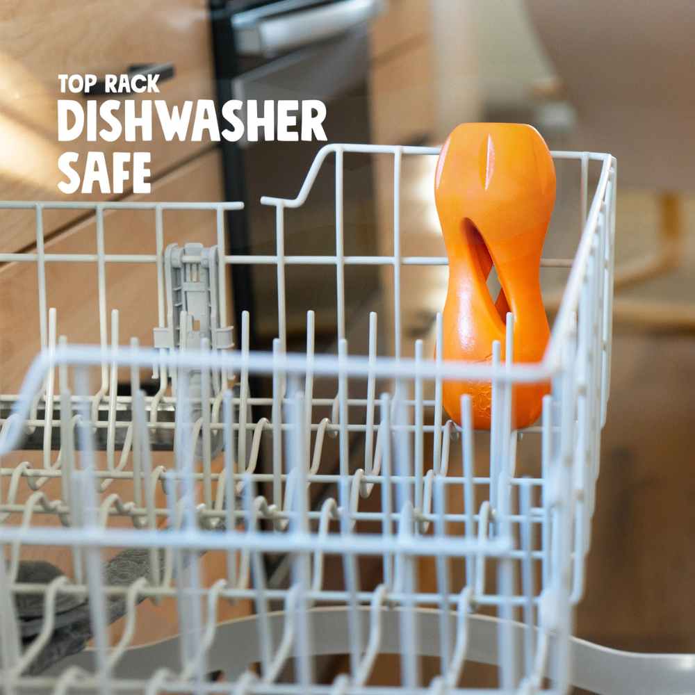 This award-winning toy was brilliantly designed to extend the life of expensive dog treats while keeping dogs busy. The side openings release scent and taste while the continuous interior hole allows treats to extend out. Flexible ridges grip multiple sizes of treats. One of our toughest dog toys, Qwizl is also fun to toss, fetch, and chew even after the treats are gone. Curved shape makes toy easy for dogs to hold in place with paws.