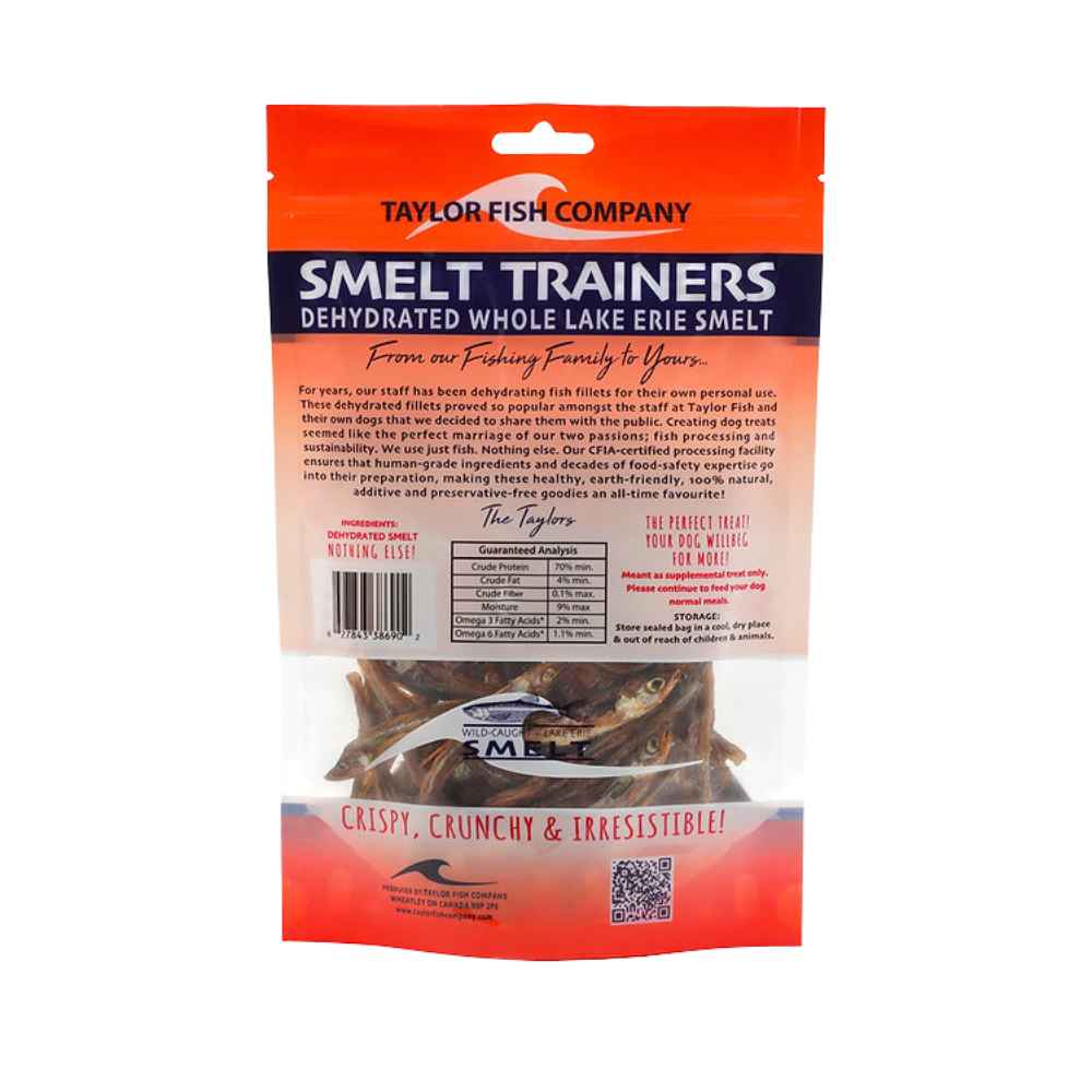 Smelt Trainers from Taylor Fish Company are made from fresh caught Lake Erie Smelt, made with no preservatives, additives, or dyes! An excellent source of Omega 3 fatty acids, protein and calcium. These natural dog treats are high in DHA and help promote your dog’s brain function and maintain the health of their skin, coat, and immune system.